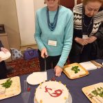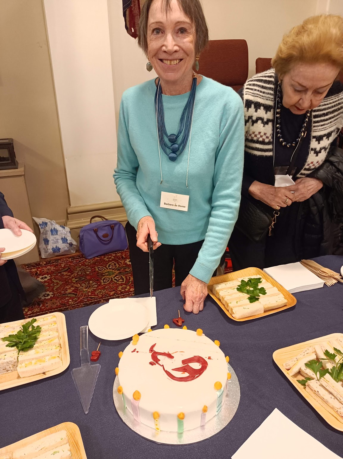 Barbara de Rome cutting the cake into slices [photo, Lis Bergmann]