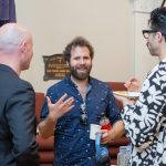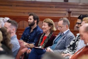 Artists’ Liaison Leona Geeves speaking about very early members the Hennessy twins [photo ,Lis Bergmann]