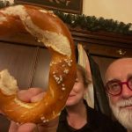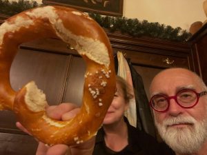 March: Arrived Munich, first port of call the Augustiner for a bretzel (someone special hiding behind partly eaten specimen), wurst and beer [photo, Esteban Insausti]