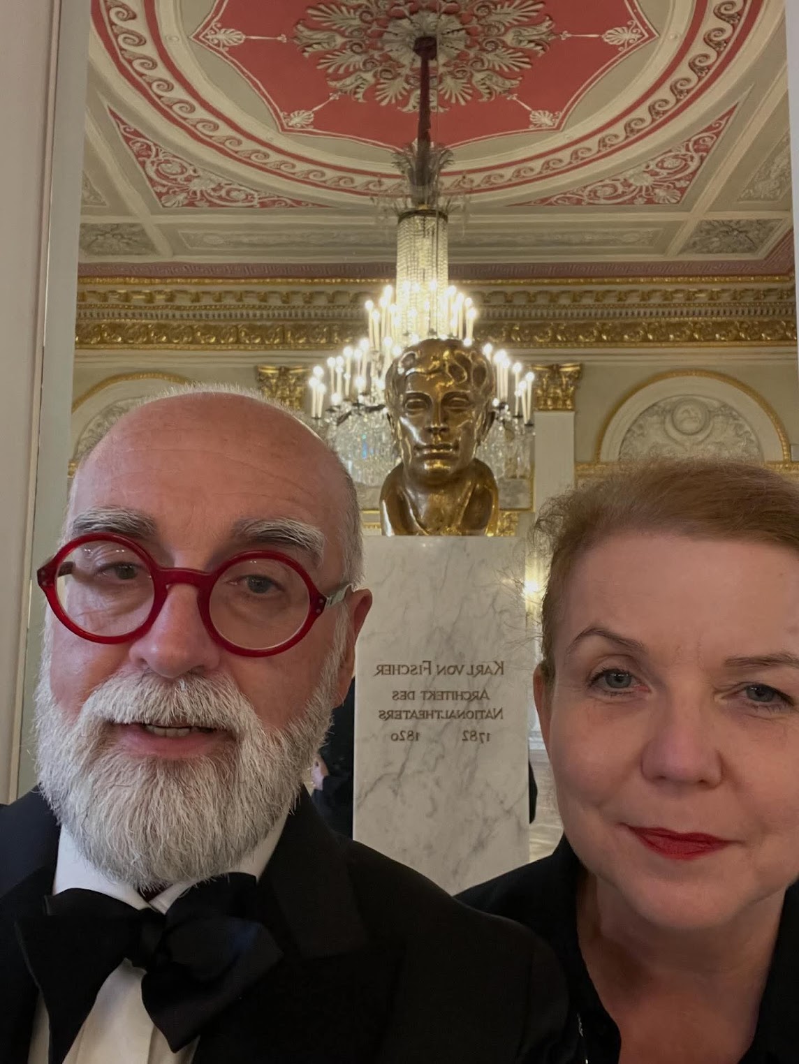 March: Esteban Insausti & Agnes Bezjek at Munich’s Nationaltheater for Rigoletto premiere. “First paying homage to the house architect Karl von Fischer” [photo, Esteban Insausti]