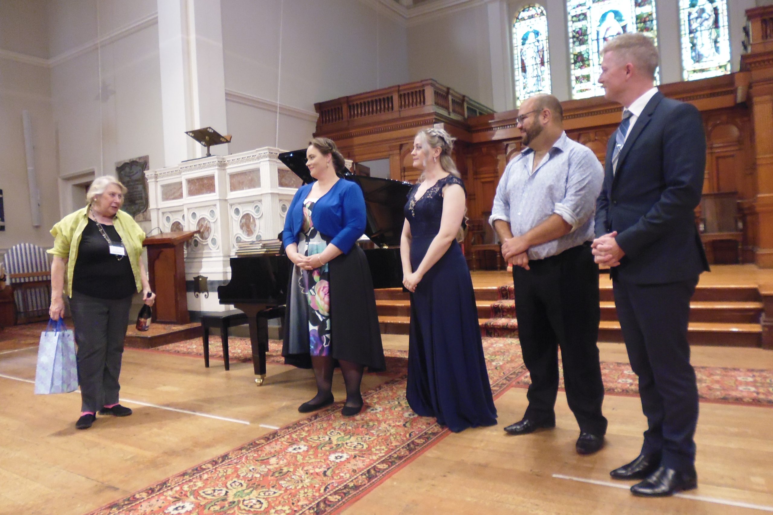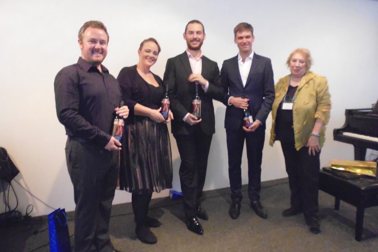 30 July 2017: Eleanor Greenwood, Warwick Fyfe, Bradley Gilchrist (accompanist) – with Leona Geeves (Vice-President) – after performing an extract from Act 2 of ‘Parsifal’ at the ‘Parsifal’ seminar [photo, Pauline Holgerson]